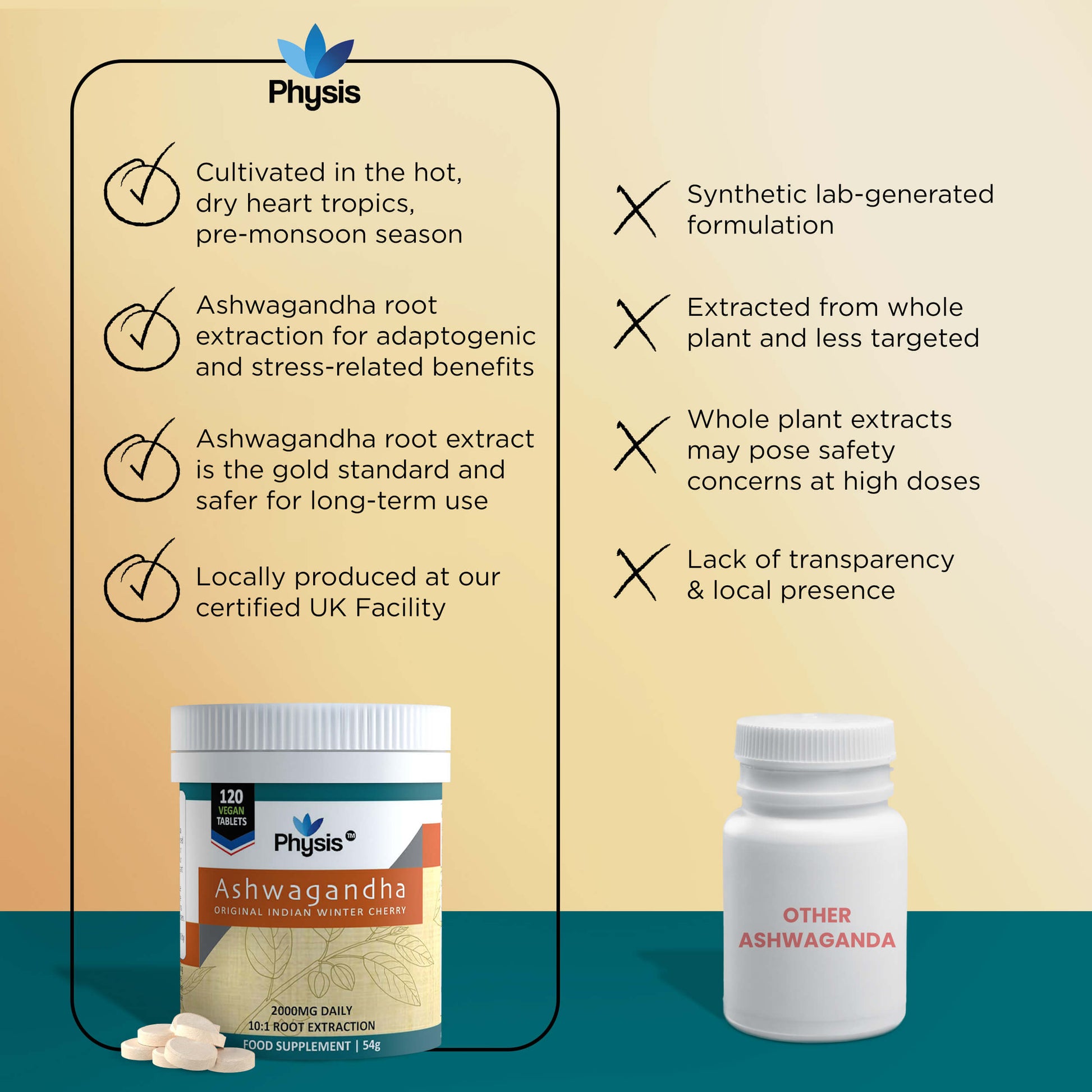 - HOLISTIC HEALTH POWERHOUSE: Physis' potent, concentrated ashwagandha tablets are derived from the sweltering, dry climate of India's inland. Ashwagandha is adaptogen, a natural agent that helps the body tackle stress & possesses many health benefits. Ashwagandha is renowned for its intense potency, and Physis' ashwagandha tablets proudly champion this reputation. Our ashwagandha supplements are one of the most potent formulas available.