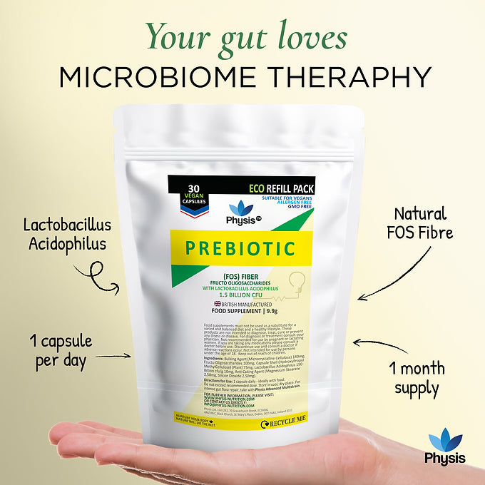 They feed the probiotic. The prebiotic is fermented in the gut and used as fuel by the beneficial bacteria found in our Physis Advanced Probiotics. The combination of the prebiotic and probiotic is a microbiome therapy and produces a by-product, postbiotics. Probiotics, prebiotics and postbiotics together boost both digestive and overall health.