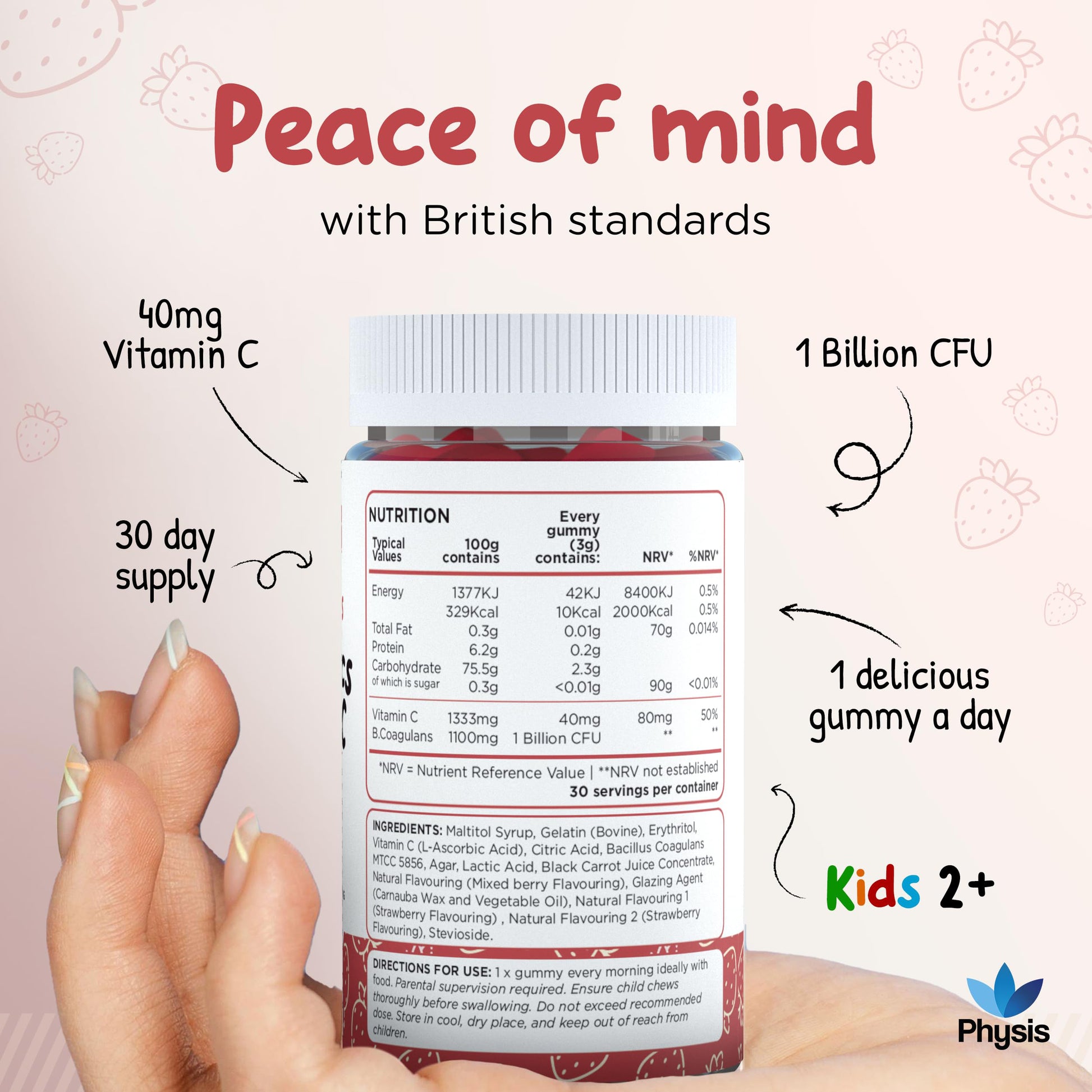 At Physis, we never rest on our laurels. Our kids' probiotic gummies are fortified with vitamin C to add another level of immunity protection for the gut. It is important that we protect the young digestive system from free radicals, hence why we went to the extra length during the development of our kids' gut gummies to fortify them with a potent, yet gentle, dose of vitamin C. This is what elevates our kids immune-boosting and probiotics gummies.