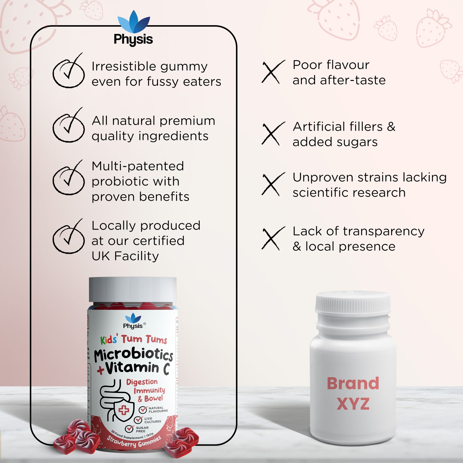 - VITAMIN C FORTIFIED FOR IMPRESSIVE IMMUNITY - At Physis, we never rest on our laurels. Our kids' probiotic gummies are fortified with vitamin C to add another level of immunity protection for the gut. It is important that we protect the young digestive system from free radicals, hence why we went to the extra length during the development of our kids' gut gummies to fortify them with a potent, yet gentle, dose of vitamin C. This is what elevates our kids immune-boosting and probiotics gummies.