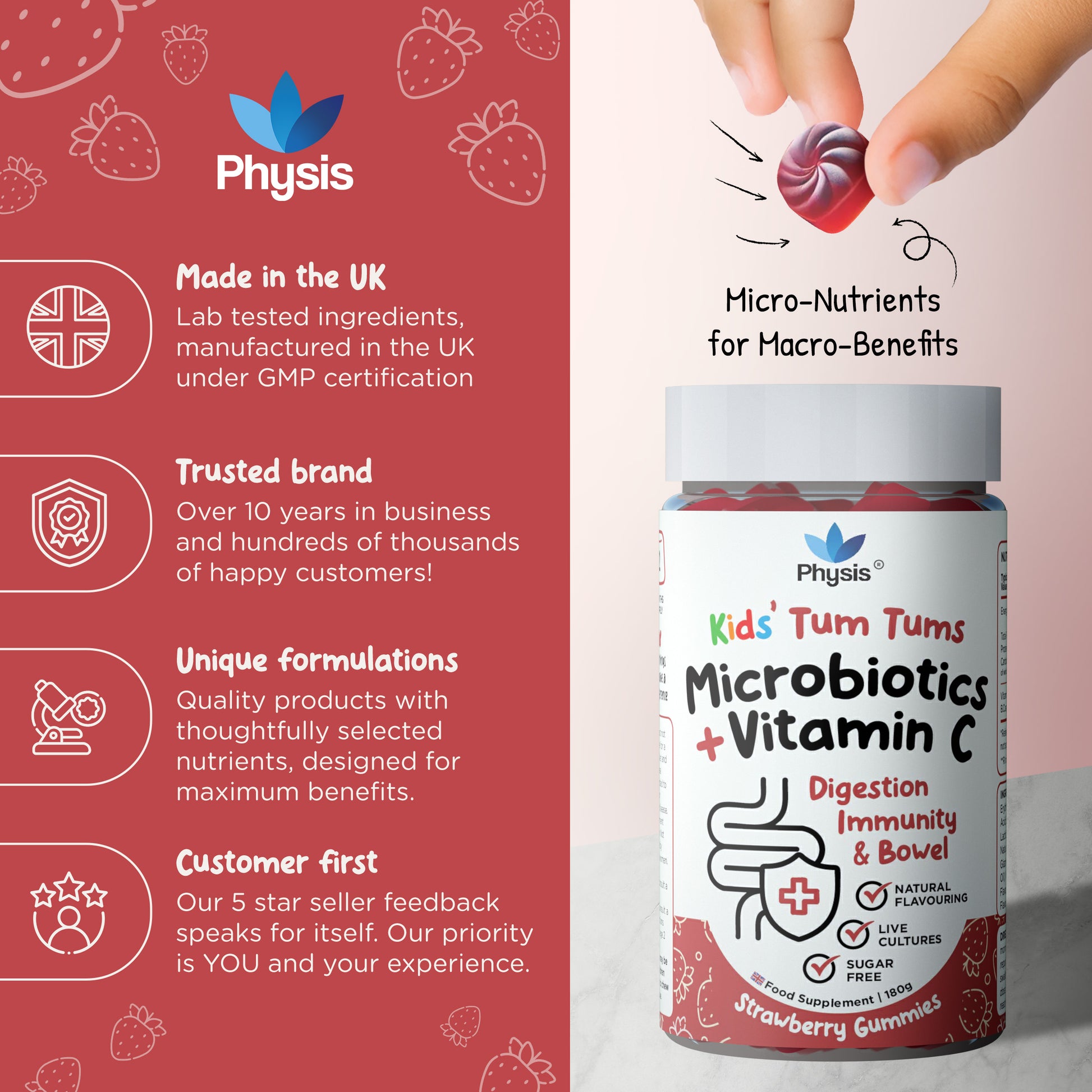 - NATURAL, HIGH-QUALITY & SUGAR-FREE - At Physis, we know that every kid's probiotic supplement that leaves our medical-grade lab must be of stunning quality. From inception, we designed our children's probiotic gummies to be easy to swallow, curated from pure ingredients, and health-boosting. Every gummy is subject to scrupulous manufacturing standards and are UK made. Our chewable probiotics for kids are formulated by our in-house health expert to ensure your child has a model digestive system.