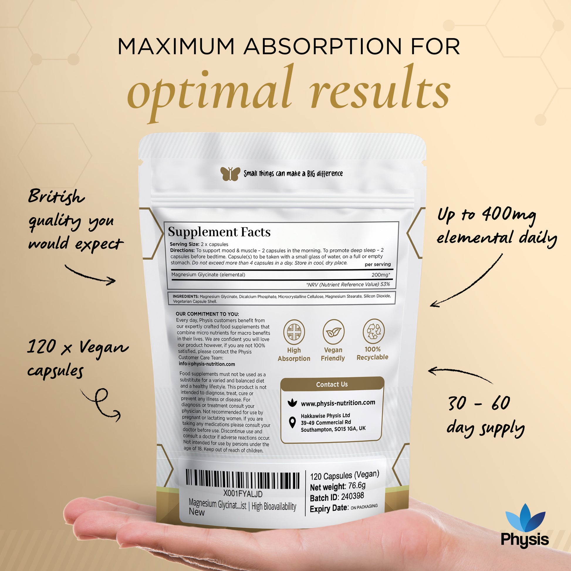 PHYSIS MAGNESIUM GLYCINATE | Deep Sleep & Anxiety Assist | 120 Capsules | 200mg - 400mg Daily | High Bioavailability | Vegan & Vegetarian - 1 to 2 Month SUPPLY