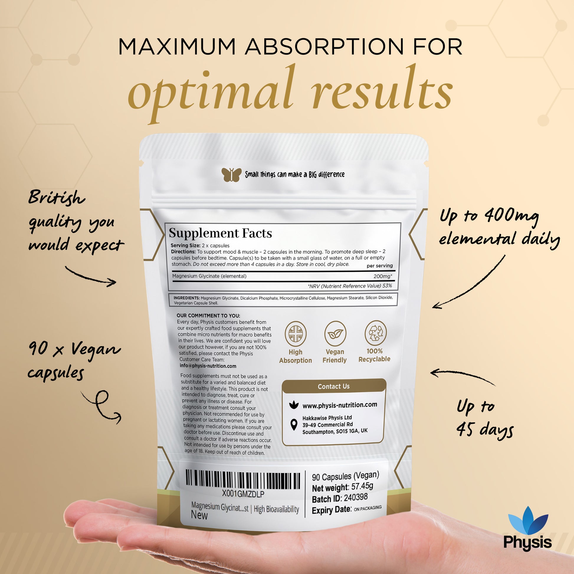 PHYSIS MAGNESIUM GLYCINATE | Deep Sleep & Anxiety Assist | 90 Capsules | 200mg - 400mg Daily | High Bioavailability | Vegan & Vegetarian - 1 to 2 Month SUPPLY