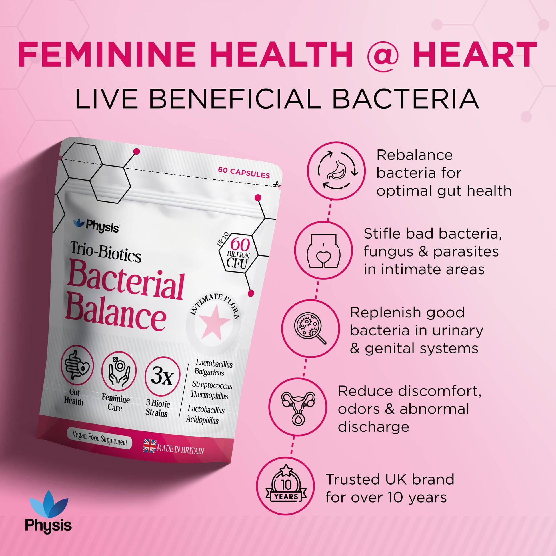 Designed by women, for women, Physis is proud to introduce Physis Trio-Probiotics for Women. A trio-power-punch of three of the more notorious strains of friendly bacteria that can assist areas of ‘la femme’ health, the immune system, digestion and inflammation in the female body
